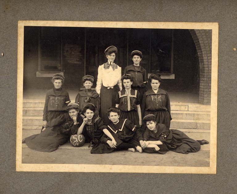 6. An original print (6 inch x 7 7/8 inch) on mat board. Pictured are ten women nine of whom wear uniforms. Ida Morgan is pictured without a uniform. A basketball to the left front has printed on it, 'F.S.C. 1904'